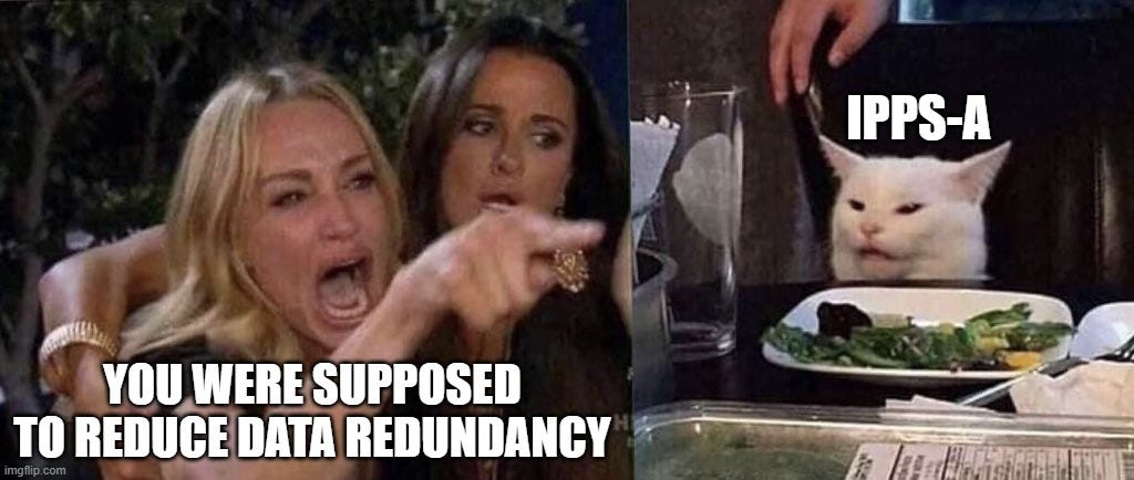 Even if the office did apply to me, all I was doing was telling the army what it already knew about me. For the travel office, I had to hand write in the names, birthdates, and DODID numbers for my wife and kids so we could purchase their flights.2 Except the army already knows I'm married. It knows my kids’ names and when they were born. It has all of their DODIDs.